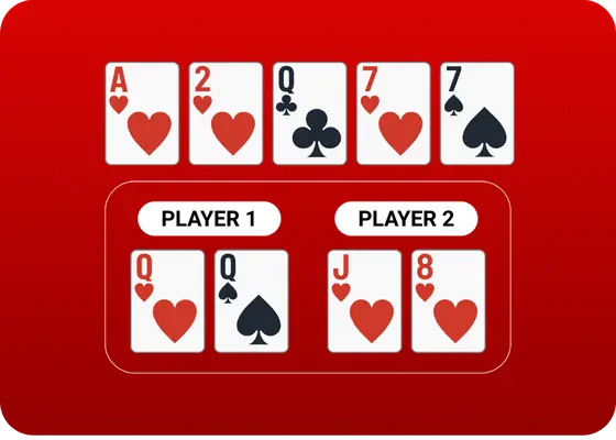 Here, although Player 2 has a Flush, which is a good hand, Player 1 can form a Full House by combining their two queens with the queen clubs and two 7’s from the board: