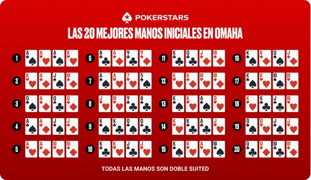Las mejores manos iniciales en el poker Omaha son las manos con dos palos diferentes, también llamadas double-suited. Dado que en el Omaha debes usar dos de tus cartas ocultas, tener una mano “double-suited” es un gran comienzo, ya que te da una doble oportunidad de ligar color. Aquí tienes una lista de las que se consideran las diez mejores manos iniciales en el Omaha (todas deben ser ”double-suited”):