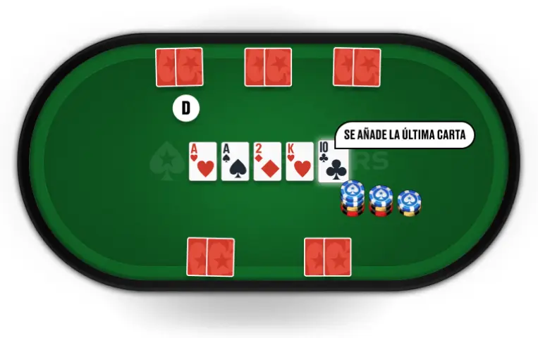Se reparte la quinta y última carta comunitaria. Los jugadores apuestan por última vez, empezando con el primer jugador activo inmediatamente a la izquierda del botón.