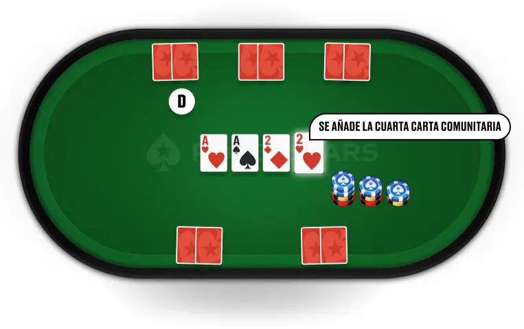 El turn revela la cuarta carta comunitaria. Una vez más, los jugadores pueden pasar, apostar, pagar, subir o foldear.