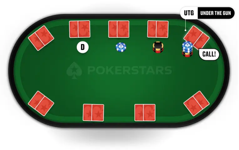 El primer jugador a la izquierda de la ciega grande actúa primero, y puede: igualar la cantidad de la ciega grande (call) o subir para aumentar la apuesta (raise), lo cual debe ser al menos el doble de la cantidad de la ciega grande. También puede foldear y tirar su mano.