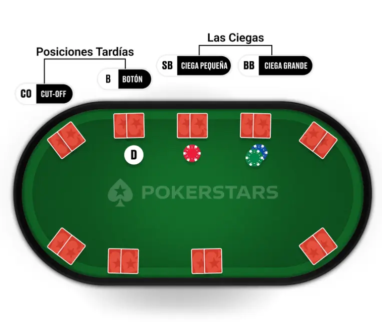 El botón del repartidor determina la posición y gira en el sentido de las agujas del reloj en cada mano. A la izquierda del botón se encuentran la ciega pequeña y la ciega grande, apuestas obligatorias que dan inicio a la acción.