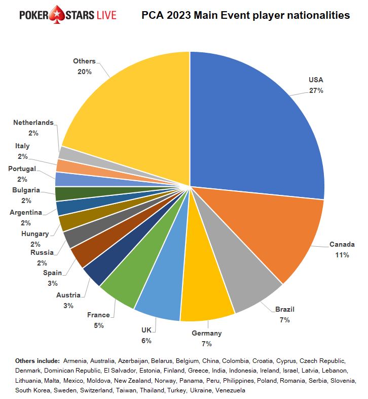 En el Main Event del 2023 de esta PCA, se registraron un total de 136 jugadores de Estados Unidos. Esto supone más de una cuarta parte de los jugadores registrados. En total tenemos 58 países distintos entre los registrados, entre ellos de toda América, Europa, Asia y Oceanía.