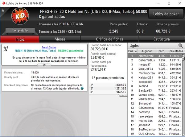 El premio más modesto de la noche para los campeones fue para «Arr0zdePat0» en esta velada UltraKO jugada en mesas de seis jugadores -como máximo-. De hecho, los 1.838,60 € que añadió a su banca como primer clasificado se quedaron lejos de los 4.300,85 € que recogió en concepto de «bounties». En total: 6.137,45 euros al peto.