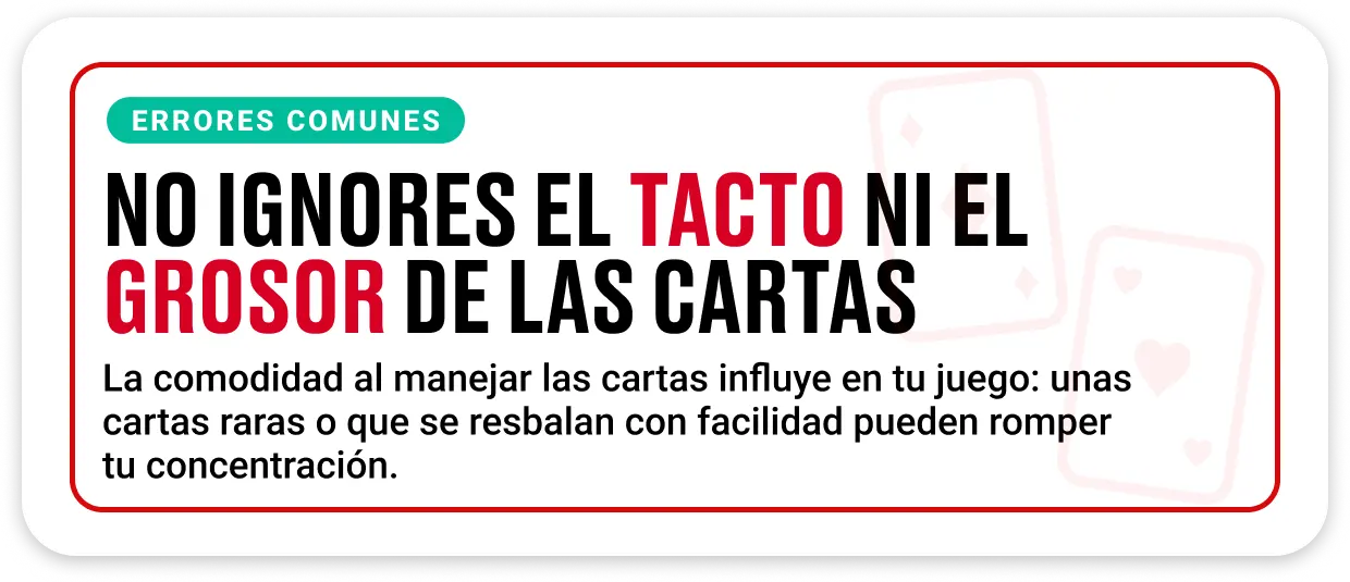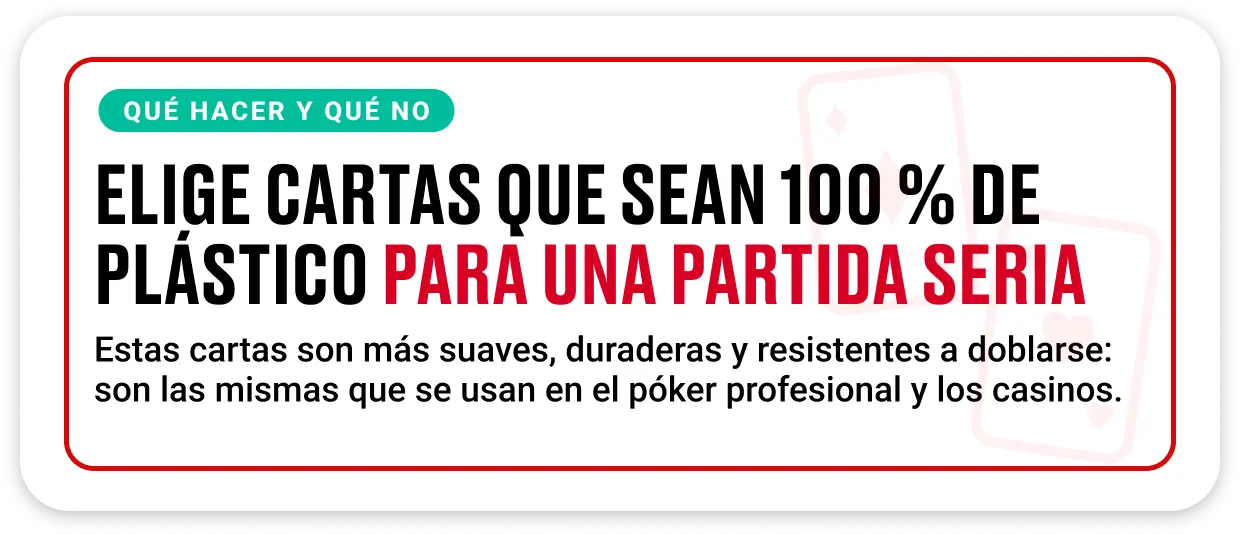 Y recuerda: puedes mezclar. Muchos jugadores tienen unas Bicycle para partidas casuales y unas Copag o Kem reservadas para las sesiones más serias. Lo importante es que, sea cual sea tu elección, te asegures de que las cartas sean cómodas de manejar y estén en buen estado.