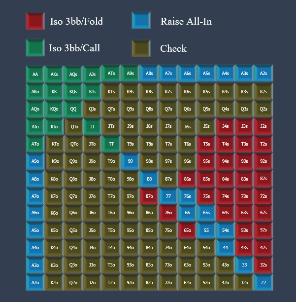 Cuando subimos desde el BB ante el limp de la SB, reducimos el tamaño de apertura a 3BB en lugar de 2BB. Estar en posición nos permite disuadir al rival de hacer push, ya que empeoramos su relación riesgo/recompensa — y eso siempre es favorable para nosotros.