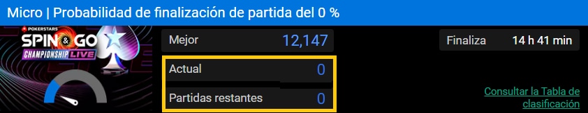 Cuando se alcanza el "Fin del juego", el intento se restablece. Tu puntuación total se añadirá a la Tabla de clasificación diaria para tener la oportunidad de ganar un ticket. También se añadirá a la Tabla de clasificación del clasificatorio para el Spin & Go Championship en vivo y tendrás la oportunidad de ganar un paquete para el Spin & Go Championship en vivo.